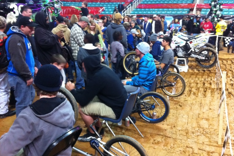 13,000 people watched in awe as the FMX and BMX action sports stars performed in the Greensboro Arena. At one point the motocross rider J.J. Romans backflipped the 75 ft. gap with a completely flat tire. It was pretty amazing but the show must go on right?